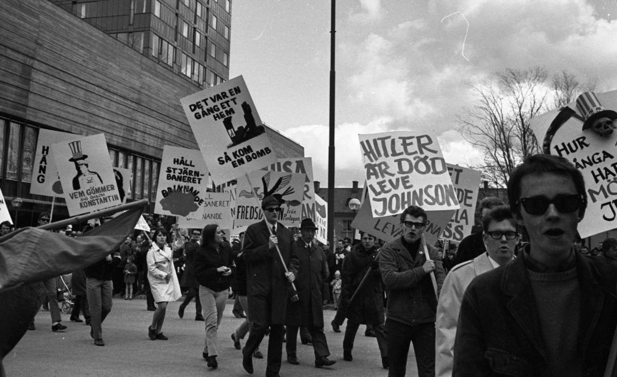 Ett första-majtåg går genom centrala Örebro. Det passerar förbi varuhuset Krämaren. Många av personerna i tåget bär på demonstrationsskyltar med text. Många kvinnor är klädda i kappor och många män är klädda i rockar.