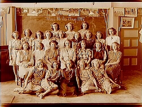 Engelbrektsskolan, klassrumsinteriör, 23 flickor med lärarinna fröken Dagny Borstedt, klass 8b, sal 24.