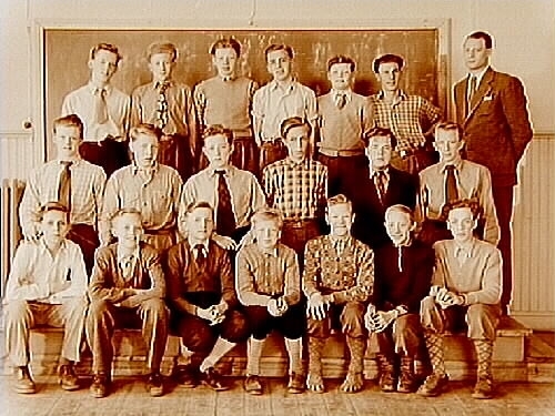 Almby Norra skola, klassrumsinteriör, 19 pojkar med lärare Martin Wistrand, klass 8C, sal 4.