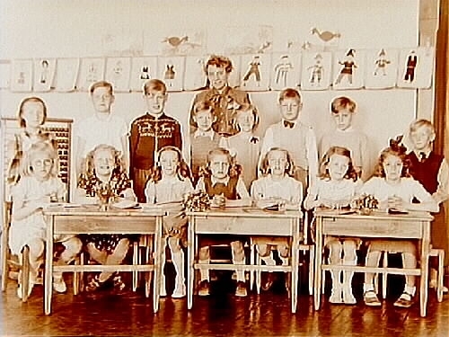 Olaus Petriskolan, klassrumsinteriör, 15 skolbarn med lärarinna fru Maria Mollbeck, klass 2c, sal 18.