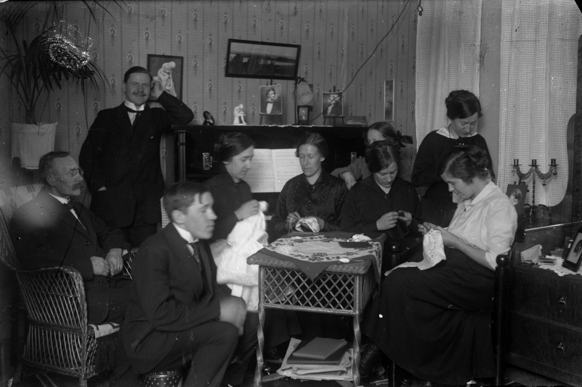 Rumsinteriör, släktgrupp nio personer i hemmet på Kungsgatan 33, Lindesberg.