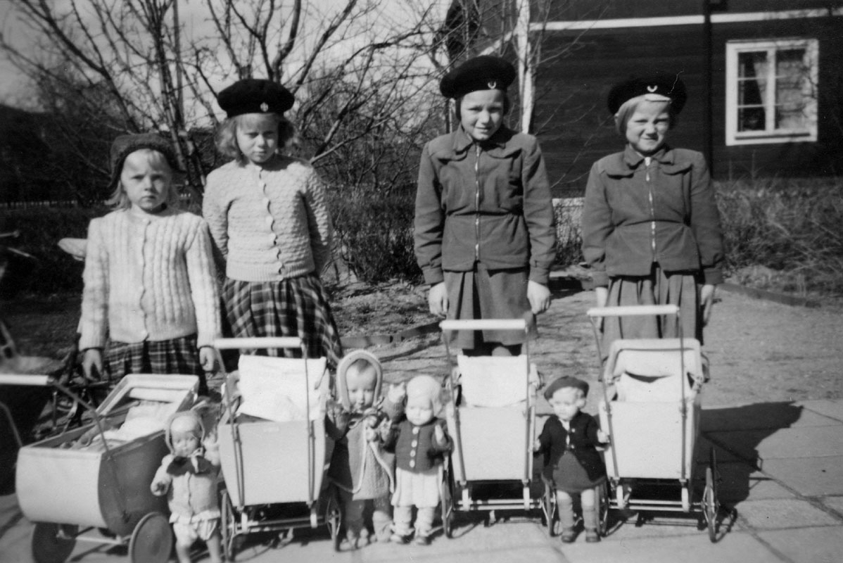 Fyra flickor med dockor och dockvagnar. "Nu har vi i alla fall fått dem att börja gå, men så är det också vår. 1950"