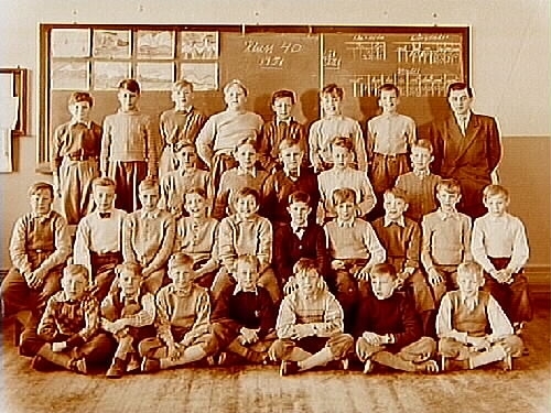 Vasaskolan, klassrumsinteriör, 29 pojkar med lärare Per Olof Engström, klass 4D, sal 1-2.