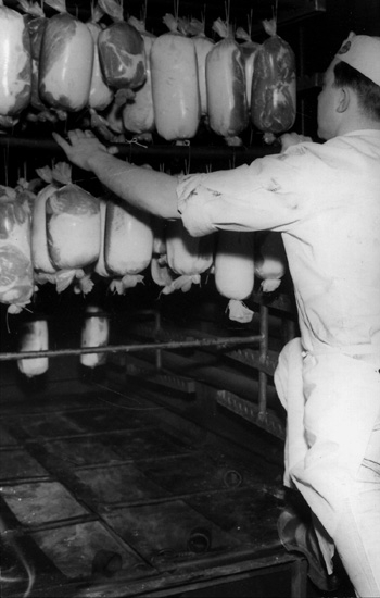 Konsum, charkuteriavdelningen, interiör av lagret, en man.