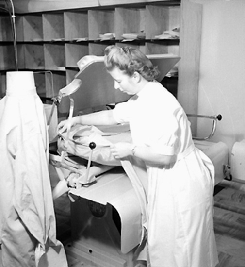 Titel: Konsums herrtvätt, interiör, en kvinna.