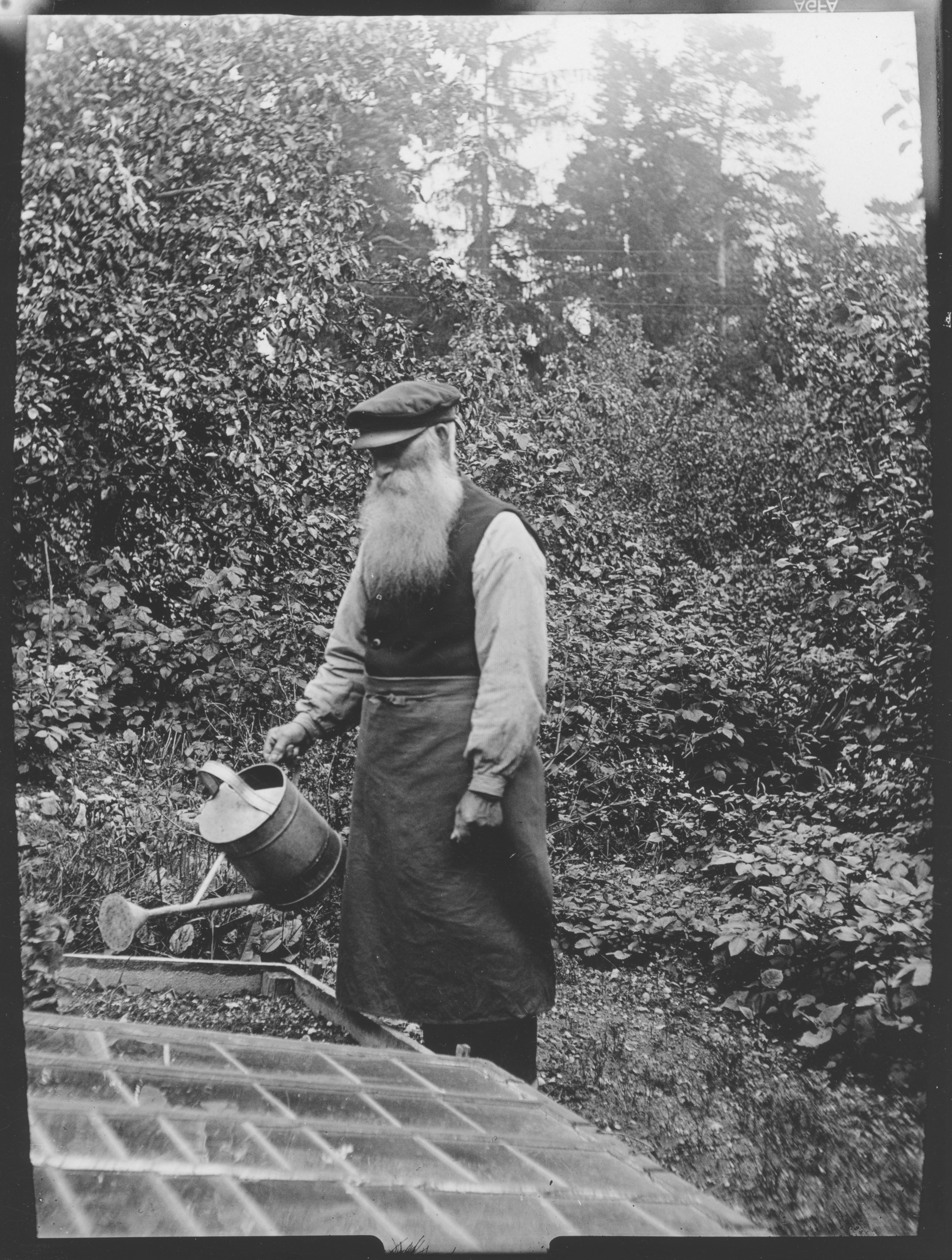 Trädgårdsmästaren Fredrik Fröding, 78 år, med en vattenkanna vid ett markväxthus.