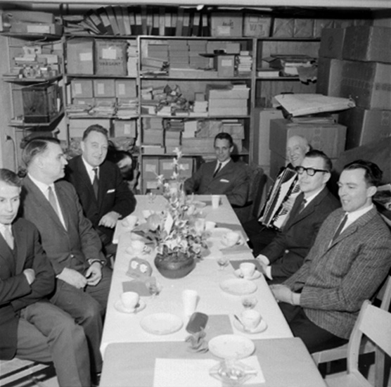 Titel: Rumsinteriör, grupp vid bordet, uppvaktning.