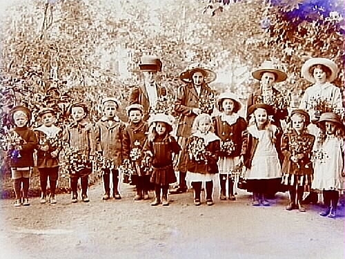 Fyra lärarinnor och elva barn i Oskarsparken.
