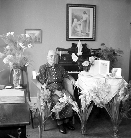 Titel: Rumsinteriör, en äldre kvinna. Fru Larsson på 80-årsdagen.