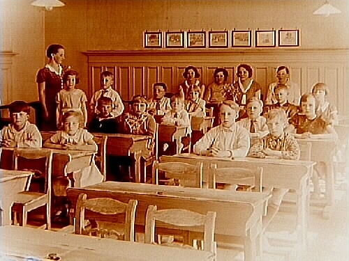 Seminarieskolan, klassrumsinteriör, 15 skolbarn med lärarinna fröken Ragnhild Forsell.