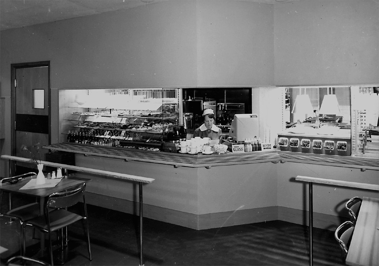 Matsalsinteriör, en kvinna.