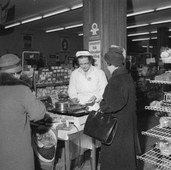 Konsum snabbköp, affärsinteriör, kunder och personal, demonstration av djupfryst mat.