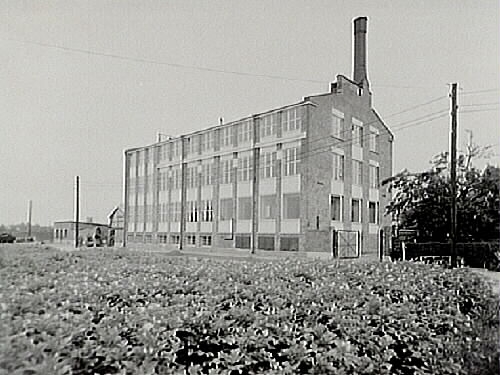 Gottfrid Karlssons Skofabriks AB, trevånings fabriksbyggnad i rött tegel med hög skorsten.