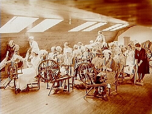 Kvinnor som spinner på spinnrockar, kardar och bråkar lin.
