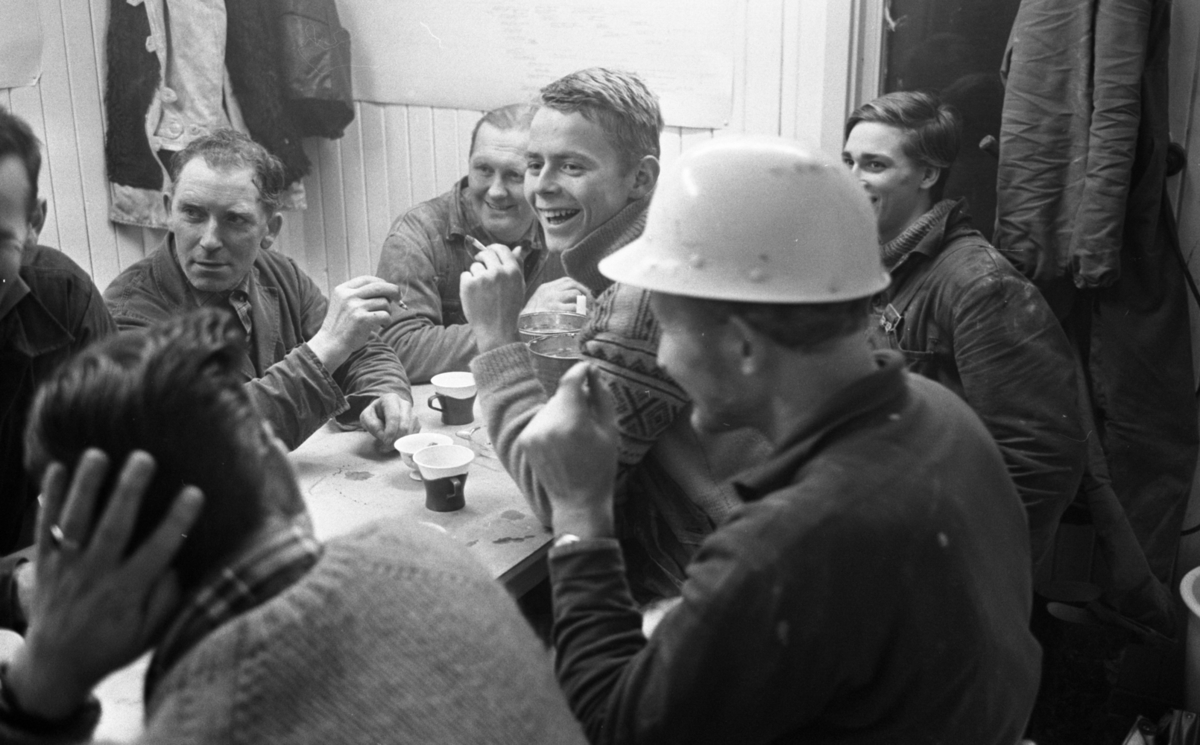 En grupp byggnadsarbetare sitter vid ett bord. De har kafferast. Många är klädda i arbetskläder och en av dem har en vit hjälm på huvudet.