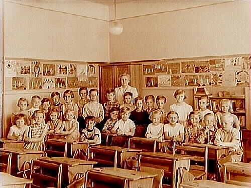 Almby Östra skola, klassrumsinteriör, 27 skolbarn med lärarinna fröken Sonja Gustafsson, klass 2au, sal 3.