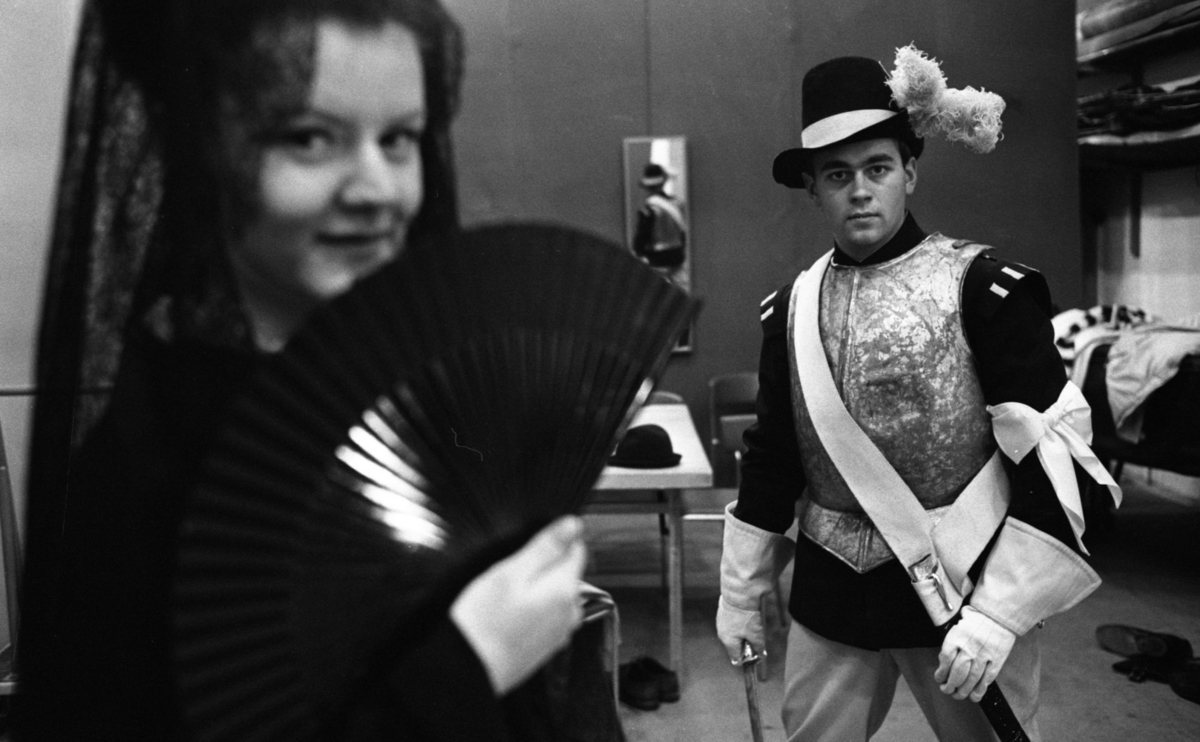 En kvinna och en man i teaterkostymer. Kvinnan står i förgrunden bär ett svart spanskt dok och en svart klänning med vit krage. Hon håller en svart solfjäder uppfälld i närheten av ansiktet. Han står i bakgrunden och är klädd i svart soldatmundering med vita kanter på tröjan samt med svartvita streck på axlarna och med rustning på bålen. Han har även en svart hatt med vita kanter och plymer på huvudet. En svärdsskida hängervid hans vänstra höft och han bär vita handskar. Han håller värjan i högerhanden. Bord och stolar syns i bakgrunden.