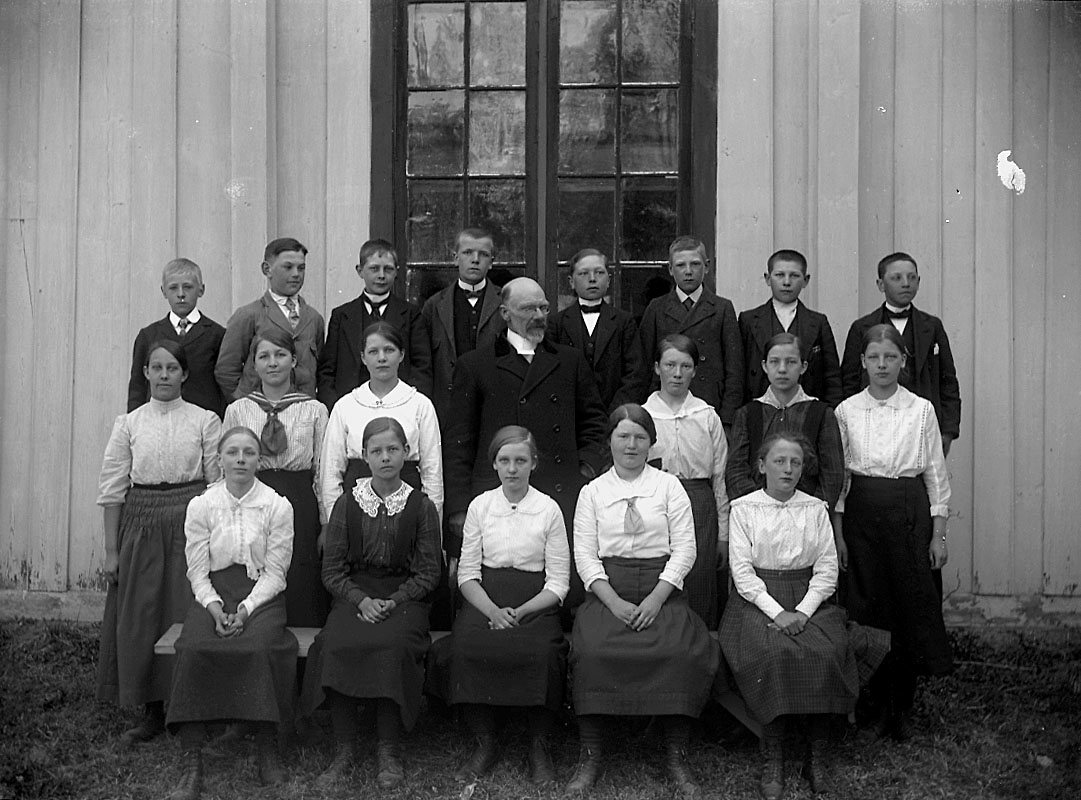 Titel: Konfirmation, konfirmander och en präst. Kyrkobyggnad.