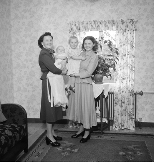 Titel: Rumsinteriör, två kvinnor och två barn, dop. Nilsson