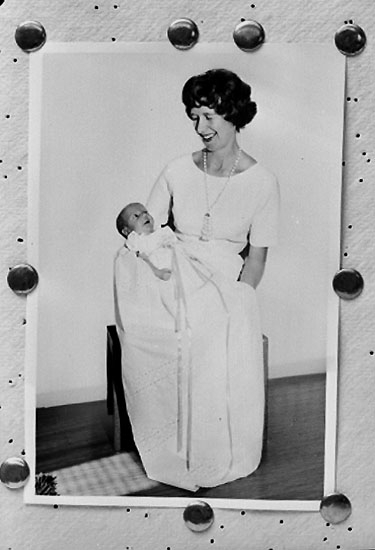 Rumsinteriör, en kvinna och ett litet barn, barndop.