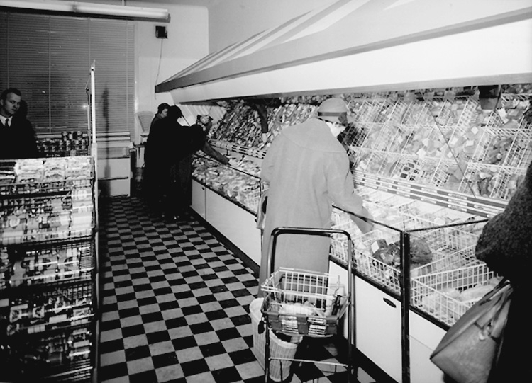 Konsum, affärsinteriör, charkuteriavdelningen, kunder och personal.