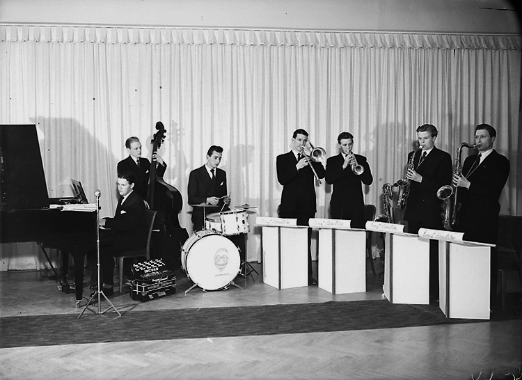 Titel: Bengt Holmströms orkester, sju män med musikinstrument.