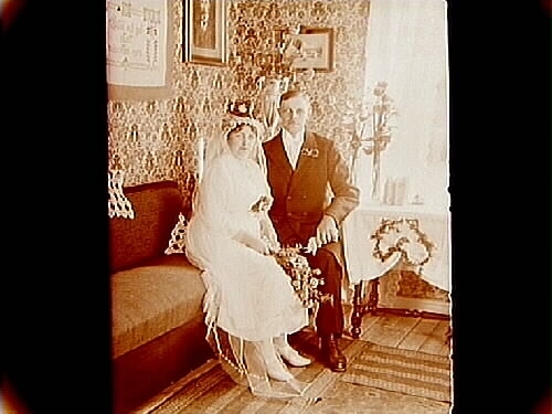 Brudpar, bruden helt i vitt, med myrtenkrona och lång slöja, brudgummen i bonjour och cylinderhatt.