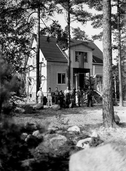 Husbygge, 9 byggnadsarbetare på trappan till huset.