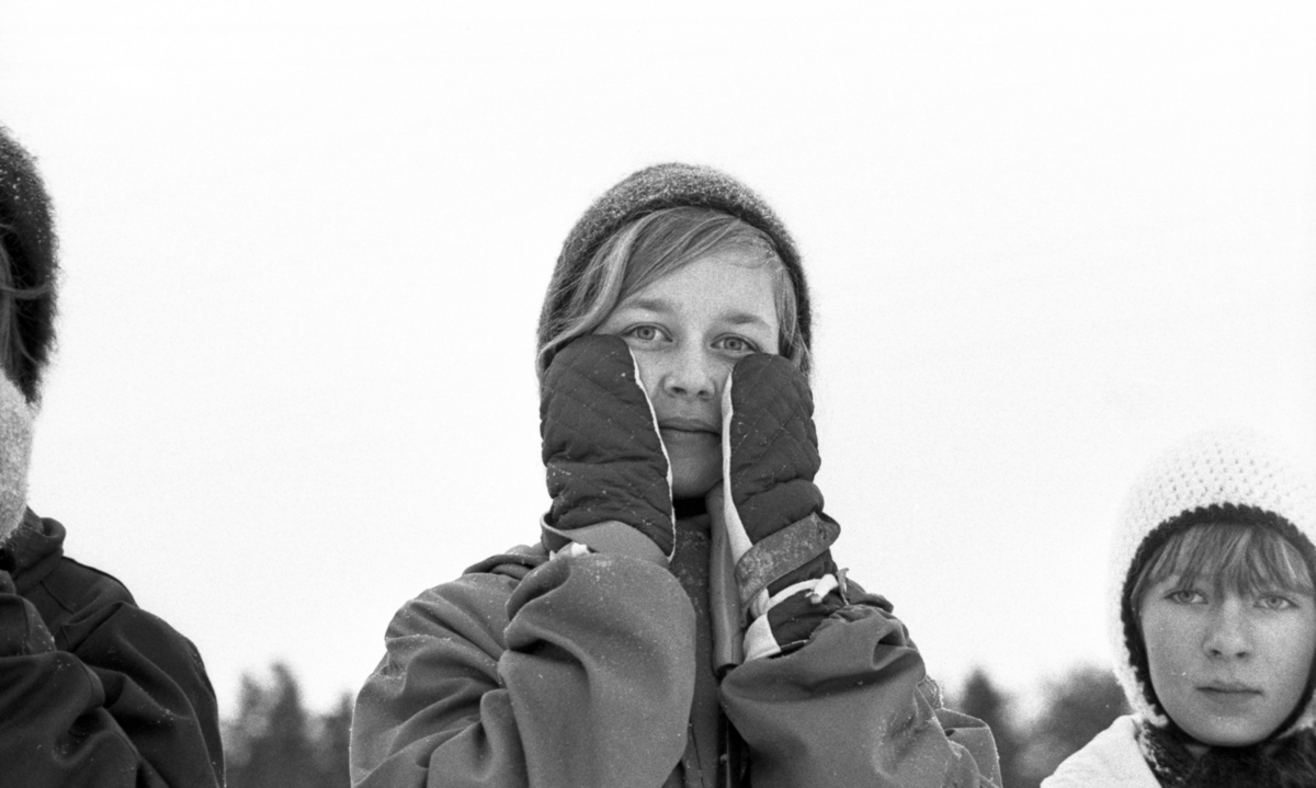 På bilden syns två flickors ansikten. Centralt i bildens förgrund syns det en flicka som är klädd i vinterkläder. Flickan har vantar på sina händer som hon håller vid sina kinder, handflatorna är vända in mot kinderna. Den andra flickan som syns åt höger i förgrunden har en ljus stickad vintermössa på sitt huvud.