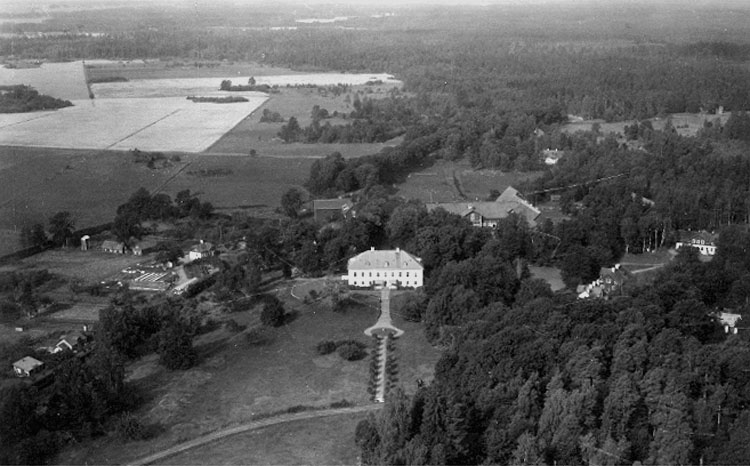 Flygfoto över Sickelsjö Herrgård, tvåvånings herrgårdsbyggnad.