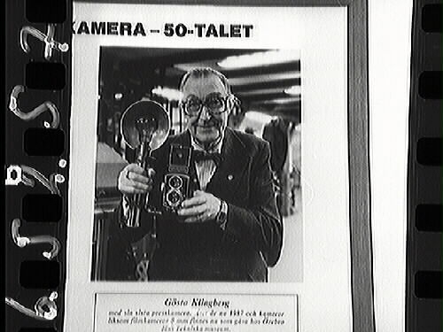 Göstas kamera från 1950-talet. Blixtstaven bad Gösta sin mor i USA att köpa och sända till Sverige. Kameran var en tysk Rolleyflex, en toppen kamera,en tidtypisk presskamera.