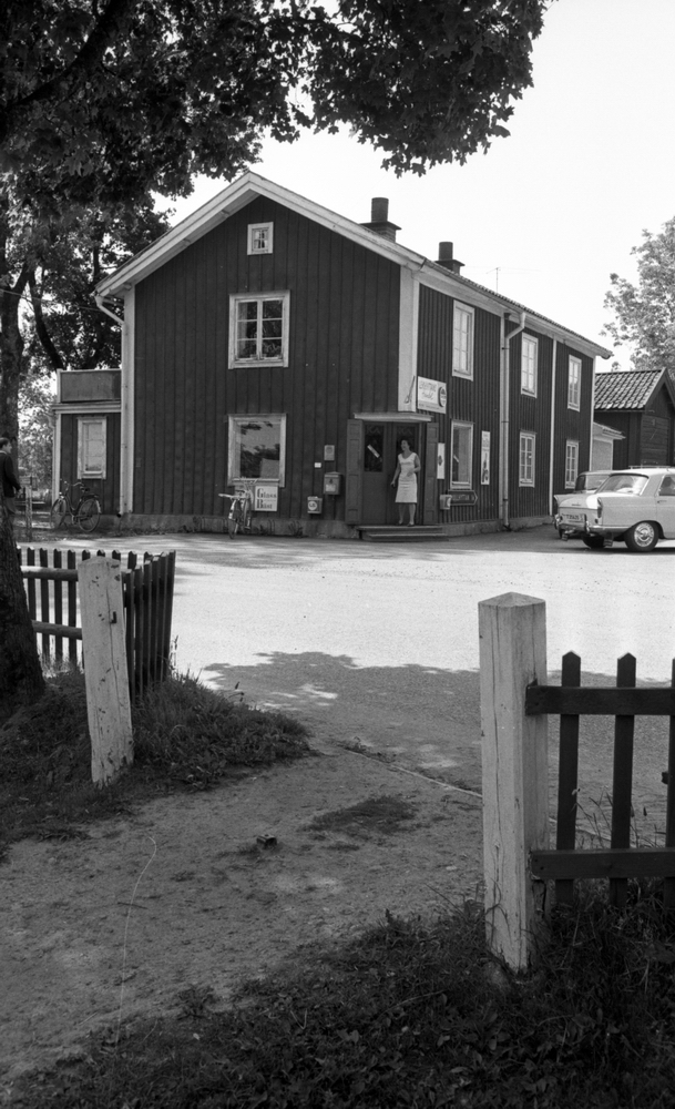 En kvinna i kort, ärmlös sommarklänning står på entr´trappan till Lekhyttans handel. Två cyklar står parkerade invid huset och två bilar syns till höger i bakgrunden.