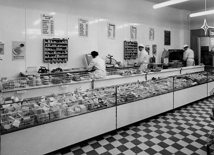 Konsum, affärsinteriör, charkuteriavdelningen, tre personer.