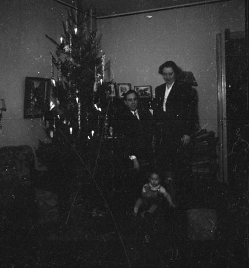Rumsinteriör, familjegrupp tre personer vid julgranen.