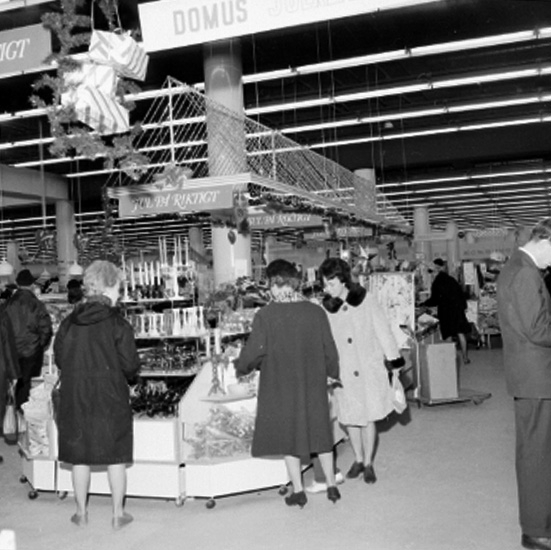 Konsum Domus, affärsinteriör, kunder och personal. Juldisk.