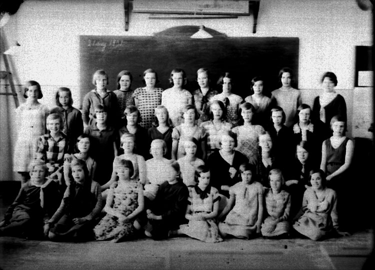 Olaus Petriskolan, klassrumsinteriör, 35 flickor med lärarinna fröken Karin Velinder.