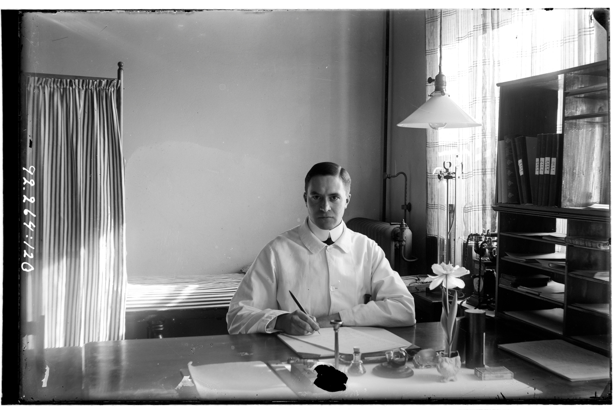 Hålahult sanatorium, interiör, underläkare A.D.M. Bonnert 1/11 1916 - 1/7 1918 sitter vid sitt skrivbord.