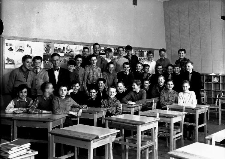 Vasaskolan, klassrumsinteriör, 34 pojkar med lärare Nils Finnhammar.