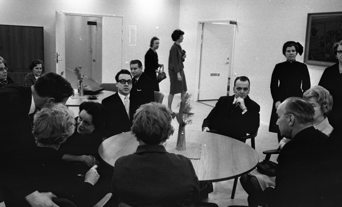 Ett antal damer och herrar sitter eller står invid två runda bord i en samlingssal. Damerna är klädda i dräkter och herrarna är klädda i mörka kostymer och vita skjortor. På borden ligger dukar och vaser med blommor i står på dessa. En portfölj ligger på bordet till vänster.
