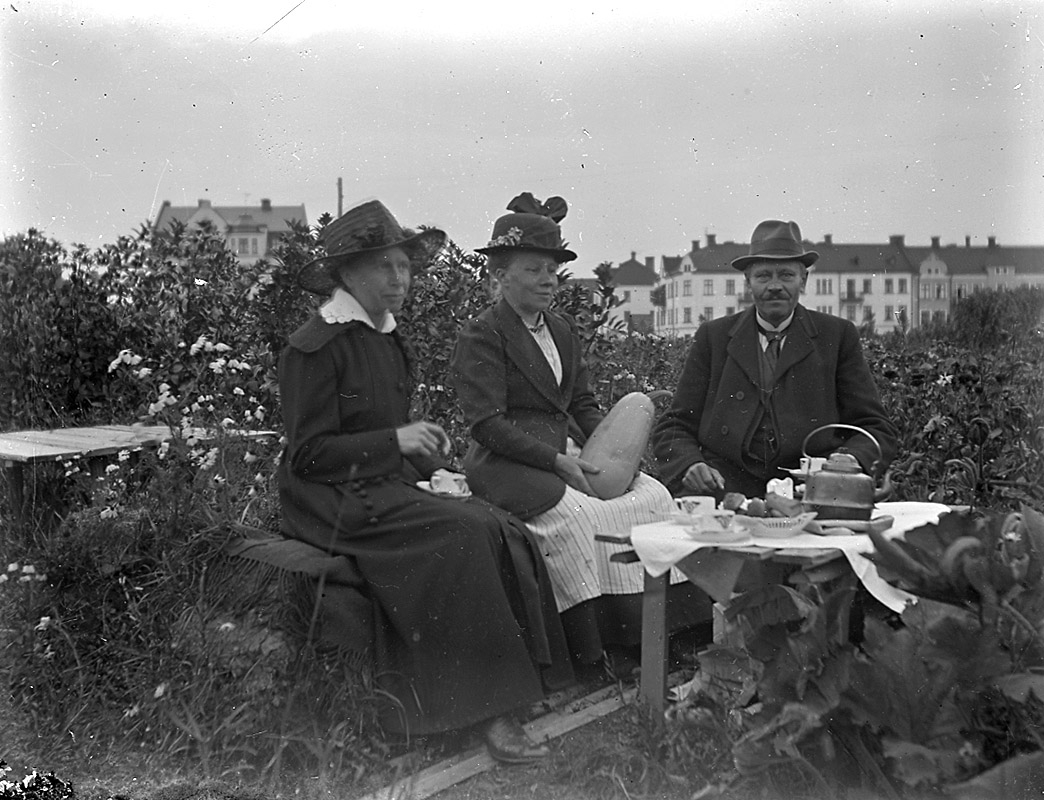 Grupp tre personer vid bordet i trädgården.