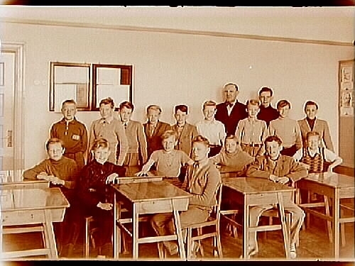 Klassrumsinteriör, 17 skolpojkar med folkskollärare David Abenius, klass 6G, sal 19.