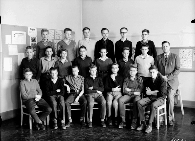 Olaus Petriskolan, klassrumsinteriör, 20 pojkar med lärare Gunnar Norlin.