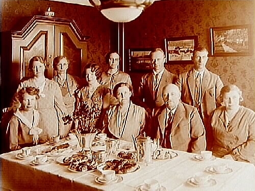 Rumsinteriör, grupp 10 personer vid kaffebordet.