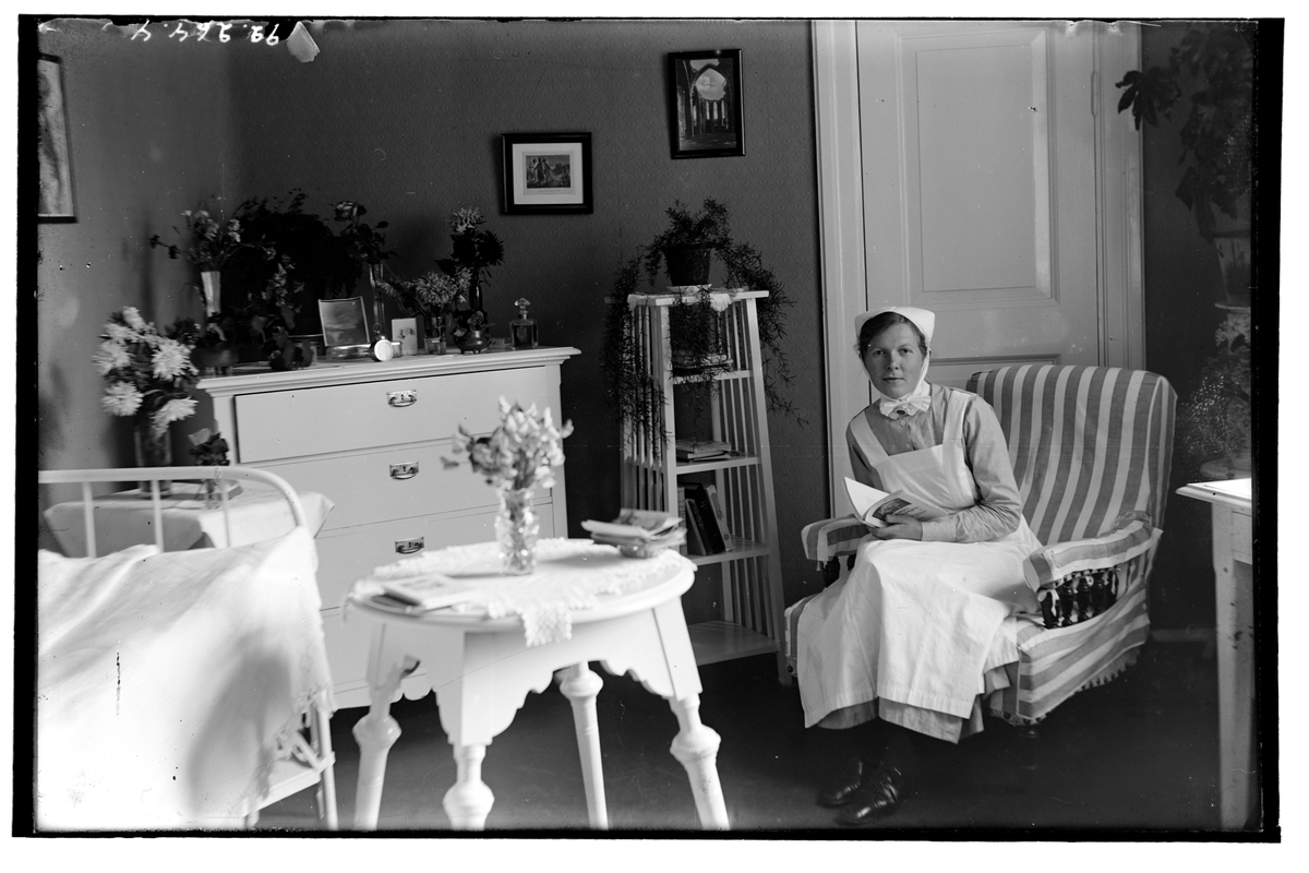 Hålahults sanatorium, interiör, sjukvårdscentralm en kvinna sittande troligen på sitt personalrum.
