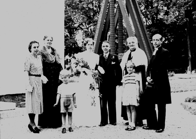 Bröllop, brudpar och bröllopsgäster vid Almby kyrka.