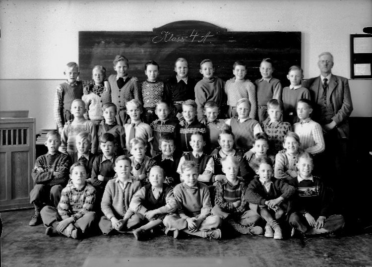 Olaus Petriskolan, klassrumsinteriör, 34 pojkar med lärare Einar Andersson.