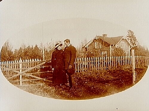 En och en halvvånings vinkelbyggt bostadshus, en man och en kvinna framför huset.