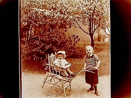 Storasyster Märta drar sin lilla syster Margit i sittvagn.