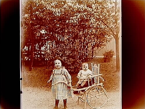 Storasyster Märta drar sin lilla syster Margit i sittvagn.