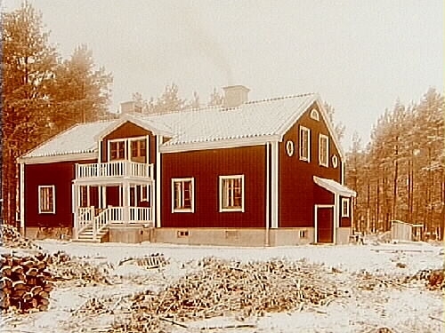 Envånings bostadshus med inredd vind, frontespis, veranda och balkong.